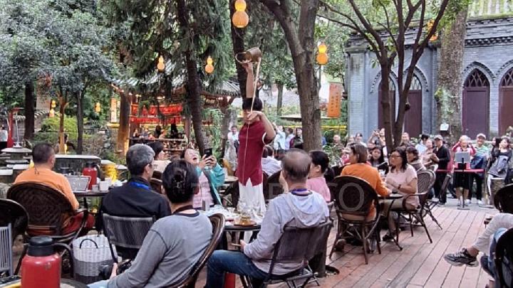 The tea-drinking tradition here is said to be more than a century old. Visitors can enjoy pouring tea with long-necked teapots, known as kung fu tea, while soaking in the ambiance of classic Sichuan culture.