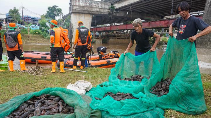 Warga menangkap ikan sapu-sapu di sungai Ciliwung, Cililitan, Kramat Jati, Jakarta Timur, 17 April 2026. Gerakan tangkap ikan sapu-sapu ini bertujuan mengendalikan populasi ikan invasif yang mengancam ekosistem kali Ciliwung. Tempo/Ilham Balindra